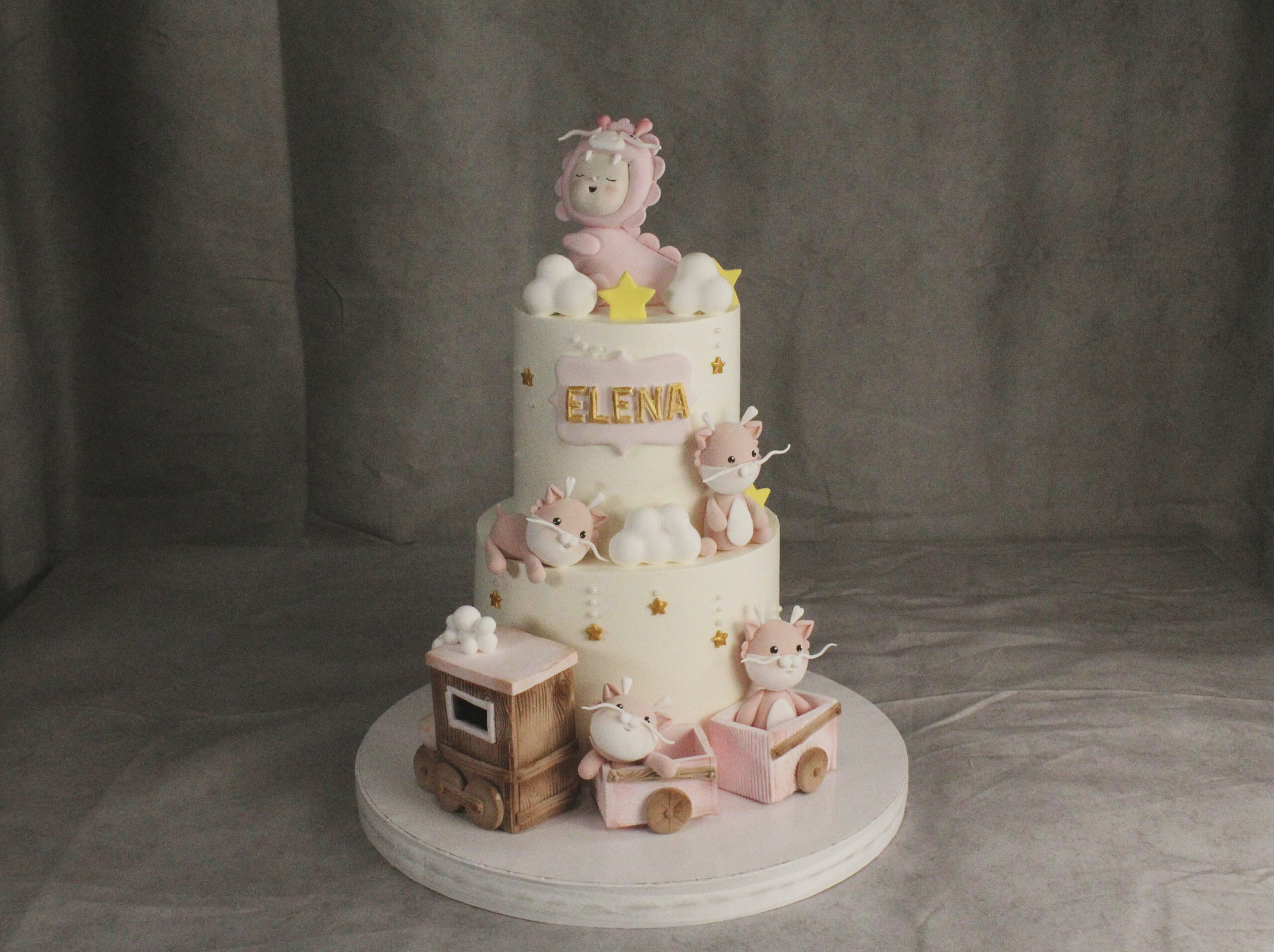 Two-tier pastel baby shower cake decorated with non-edible modeling foam figures