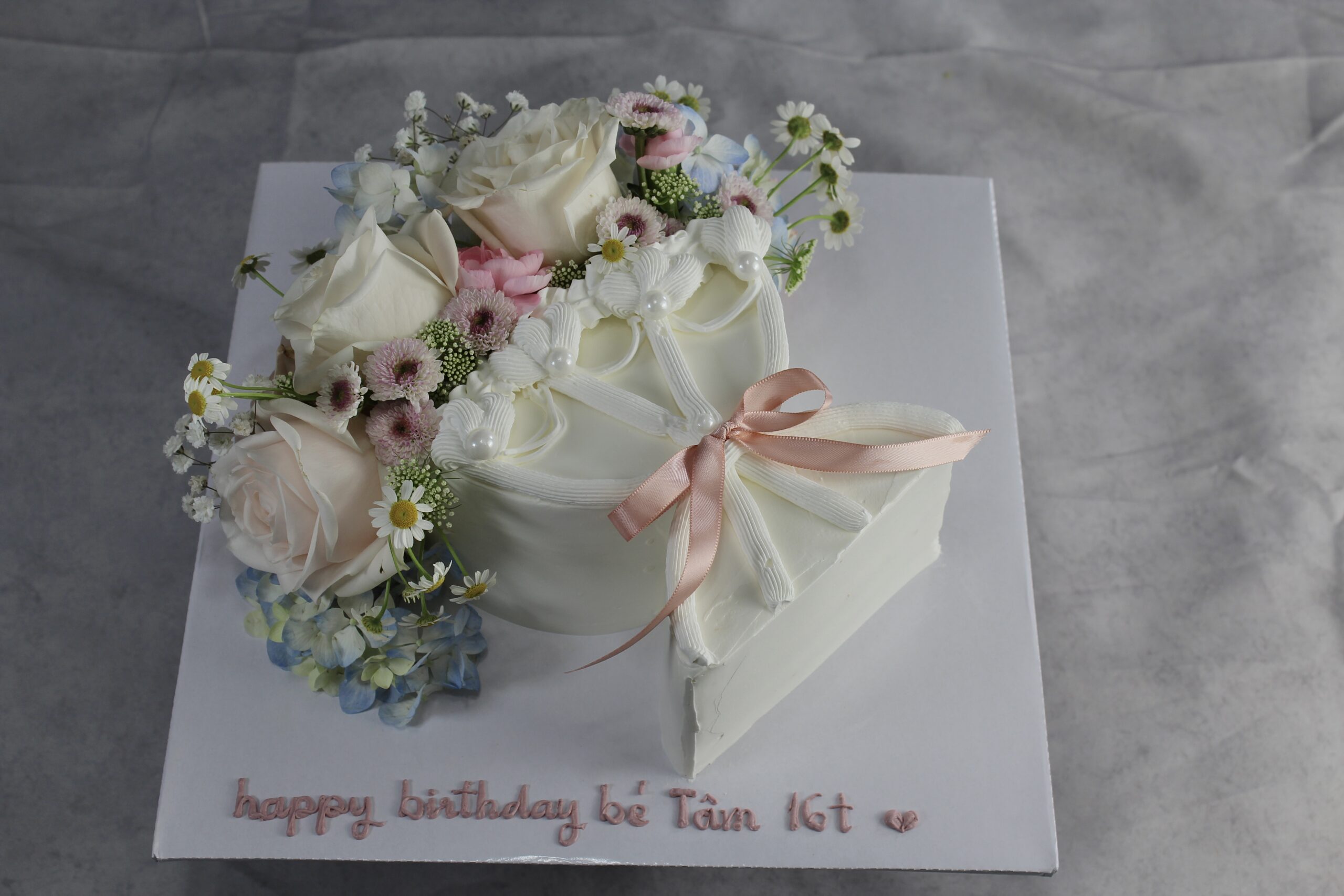 A graceful white cake decorated with fresh roses, daisies, and pastel blossoms, finished with elegant ribbon details. A beautiful choice for birthdays, weddings, and special celebrations.