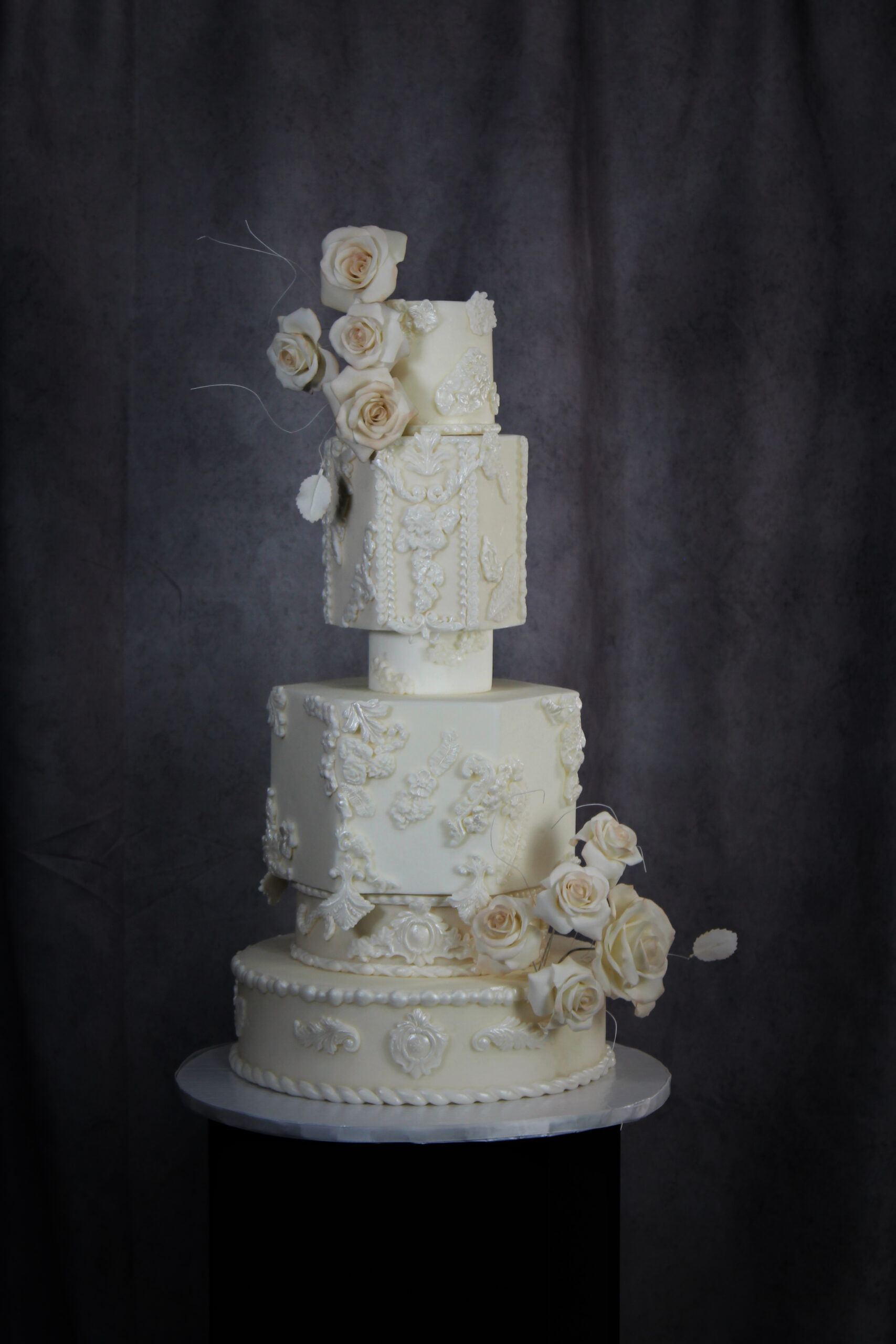 An all-ivory wedding cake adorned with delicate lace-inspired detailing and soft sugar roses. Its sculpted textures and gentle tones create an elegant, timeless look. Ivory Reverie brings a classic, romantic feel to any celebration while remaining refined and effortlessly graceful.