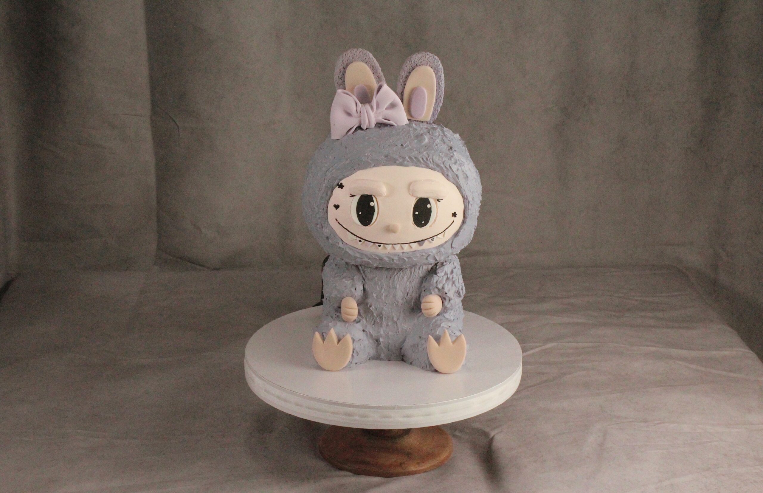 All-cream sculpted cake in the shape of Labubu, featuring a textured purple fur finish, facial details, and signature bunny ears.