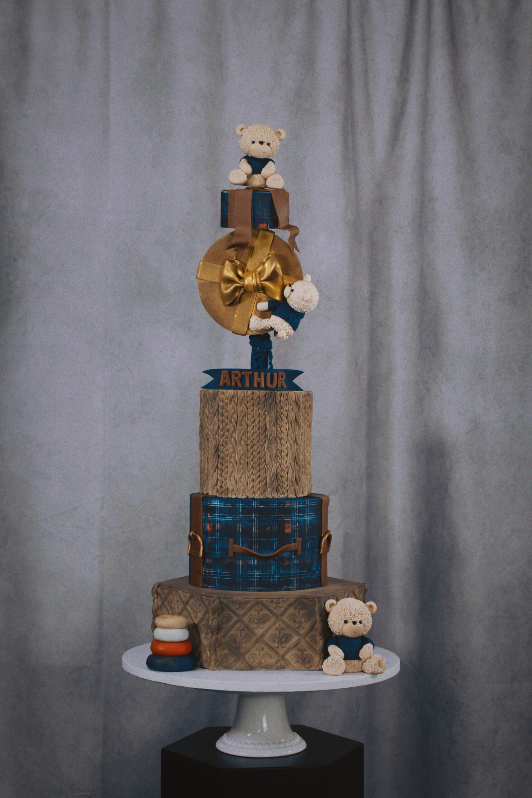 A whimsical teddy bear–themed cake with knit textures and suitcase details, designed to capture the magic of childhood and adventure.