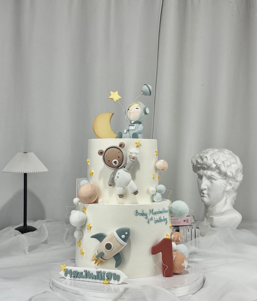 Whipped cream cake with non-edible modeling foam figures of astronaut, rocket, planets, and stars. Edible figure options available upon request.