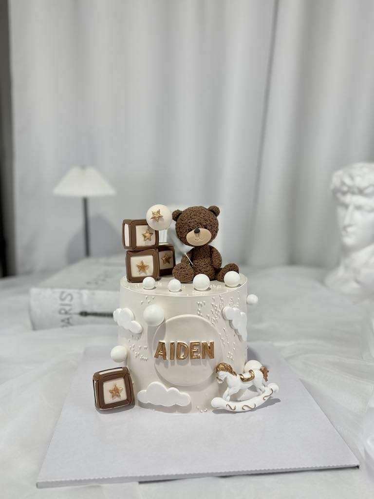 Adorable teddy bear cake with toy blocks, clouds, and a rocking horse (decor made from non-edible modeling foam; edible versions available upon request for an extra charge).