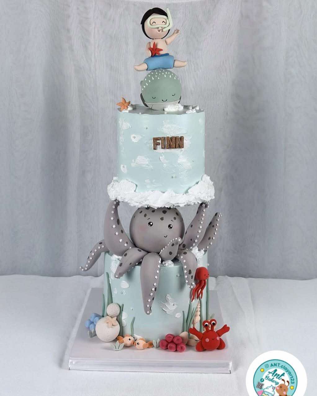 Whipped cream cake with non-edible modeling foam figures of diver, octopus, and sea creatures. Edible figure options available upon request.