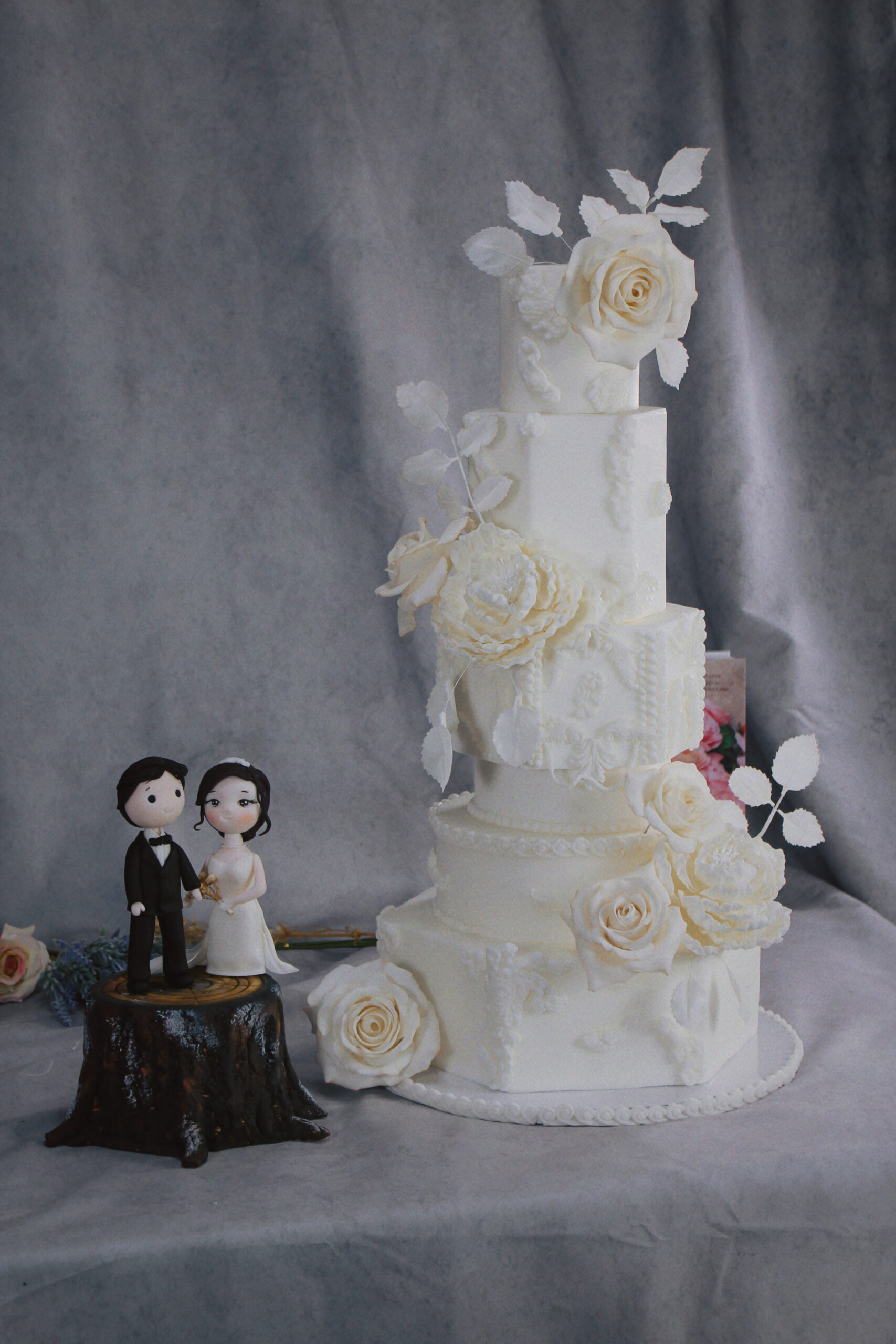 A soft ivory wedding cake decorated with delicate lace details and elegant sugar blooms. Its tall, graceful silhouette is accented with handcrafted roses and gentle leafy touches. Whispered Lace brings a light, romantic feel—perfect for couples who love timeless beauty with a modern, refined touch.